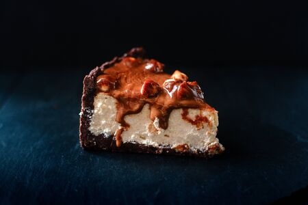 A piece of cheesecake with hazelnuts and caramel on a black background.