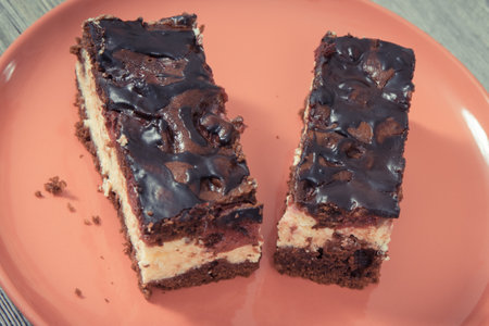 Homemade layered cake, with one layer of chocolate and one cheesecake. Slices of cheesecake brownie in bright light on a pink colored table