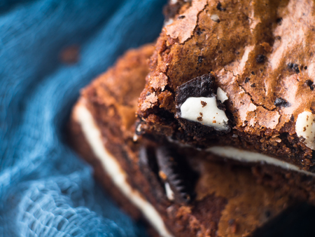 Cream cheese brownies with cookies on blue. Winter christmas treat square chocolate bars. Macro closeup detail