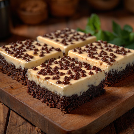 Chocolate chip dessert squares on a wooden board evoke warmth and delight.