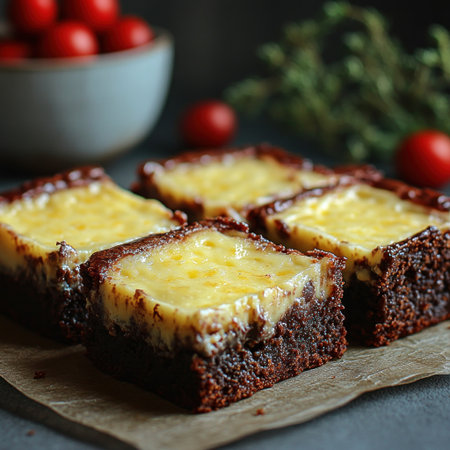 Soft chocolate squares topped with a creamy layer, surrounded by ripe tomatoes and herbs.