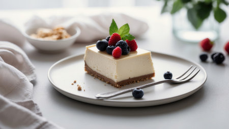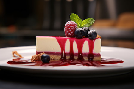 An AI generated illustration of a piece of delicious cheesecake with berries on the table