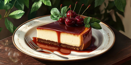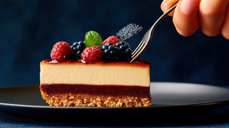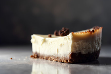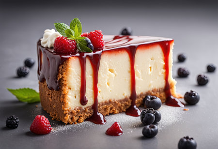 slice of creamy cheesecake, showing its smooth texture and decadent toppings in macro detail.