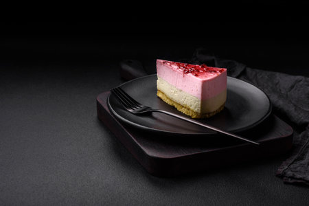 Delicious sweet dessert cheesecake with raspberry and pistachio flavor on textured concrete background