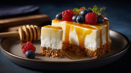 Delicious Cheesecake with Caramel Sauce and Fresh Berries on Plate