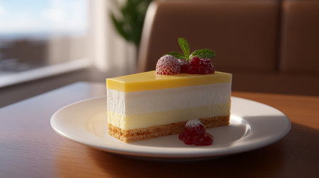 A scrumptious slice of lemon cake with layers is presented on a white plate, adorned with fresh raspberries and mint.