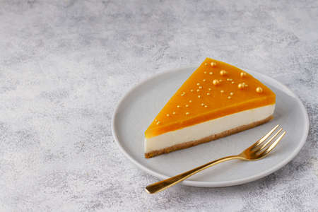 Slice of cheesecake with orange layer on a plate, copy space, gray background