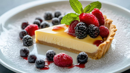 A scrumptious slice of cheesecake decorated with fresh berries and mint leaves, artistically placed on a white plate against a dark background. Perfect for dessert lovers.
