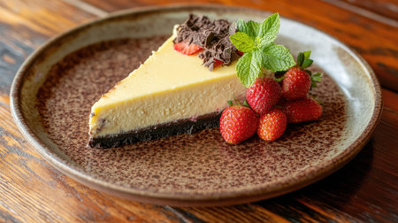 Smooth cheesecake slice with a hint of chocolate, topped with strawberries and mint sprigs on a rustic wooden plate, soft natural light.