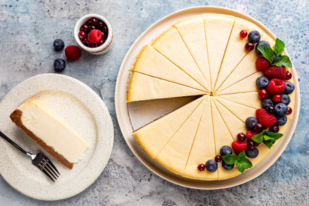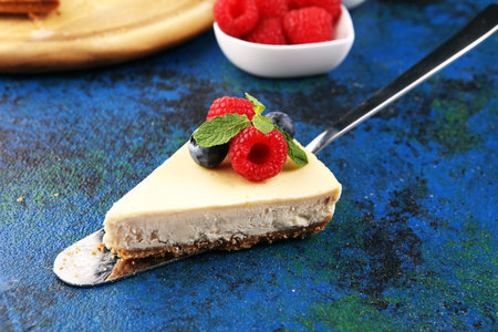 Classic New York cheesecake with fresh berries on light blue concrete background