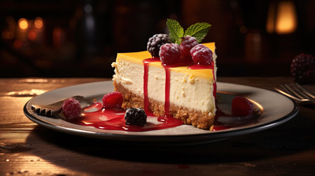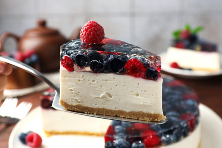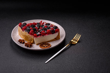 portion of cheesecake with berries. Delicious pastries. Vegan food. Gluten free. Lactose free