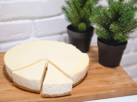 Classical new york cheesecake with slice cut out on a plate. Tasty cheesecake