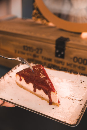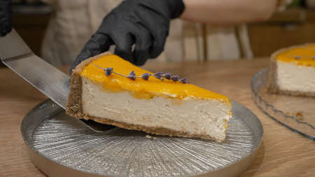 Fresh prepared homemade cheesecake on plate. Delicious dessert concept