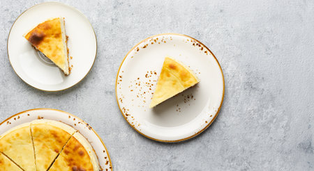 A cut piece of cheesecake on ceramic white plates on a concrete gray background. Top view with copy space cottage cheese pie casserole.