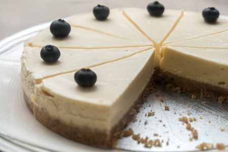 Classical New York Cheesecake with blueberries on white background. Closeup view