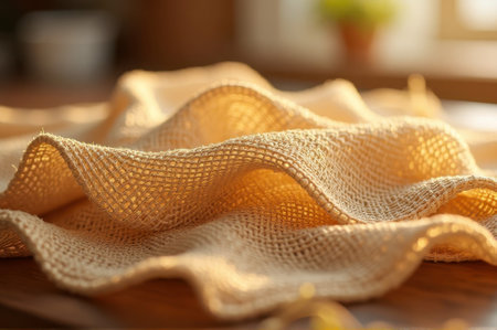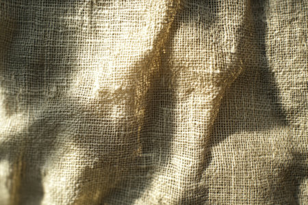 Close-up of textured burlap fabric with soft sunlight highlights. That the image is generated using AI.