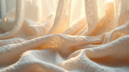 An ethereal fabric is captured in motion, illuminated by sunlight. The flowing material displays soft textures and a range of cream and white hues. The composition and lighting create an abstract and dynamic visual, suitable for various design applications and commercial purposes.