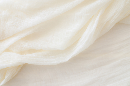 Close-up of lightweight cream gauze fabric with flowing folds and frayed edges, showcasing its airy texture and natural softness.