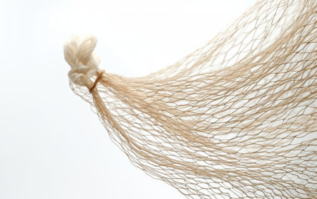 This image showcases a beautifully textured natural fiber net draped on a wooden shelf, creating intricate shadows on a white wall. Perfect for decor themes.