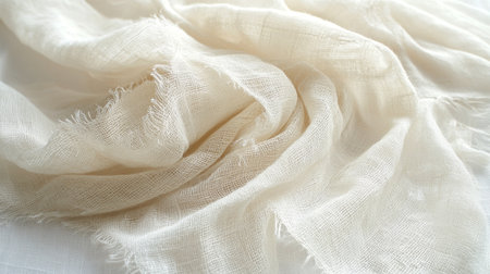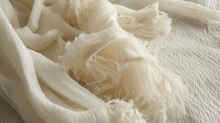 Close-up view of soft, creamy fabric with delicate frayed edges on a textured background, perfect for textile design and artistic projects emphasizing natural beauty.