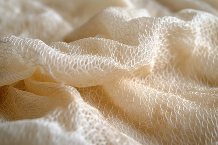 Close-up view of a soft, creamy fabric texture featuring gentle, flowing waves. Ideal for backgrounds in interior design, fashion, and textile presentations.