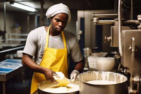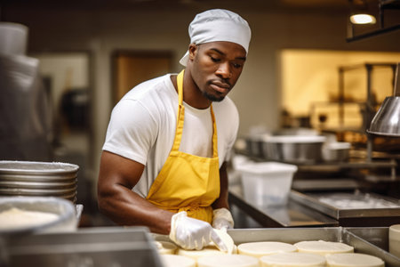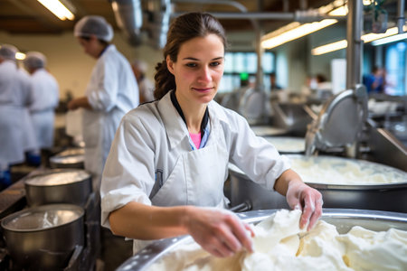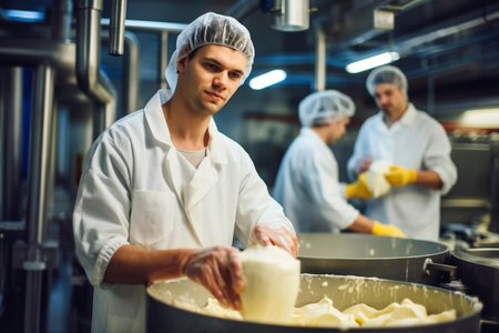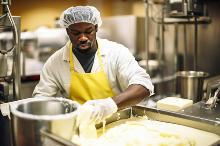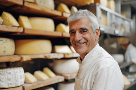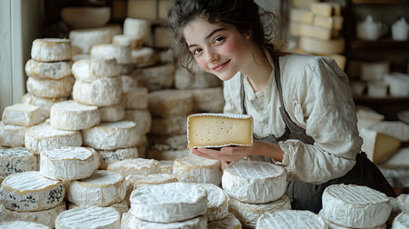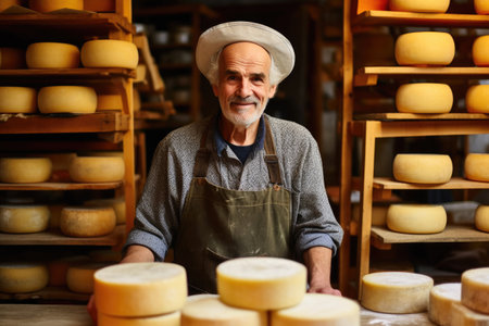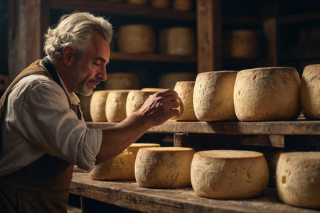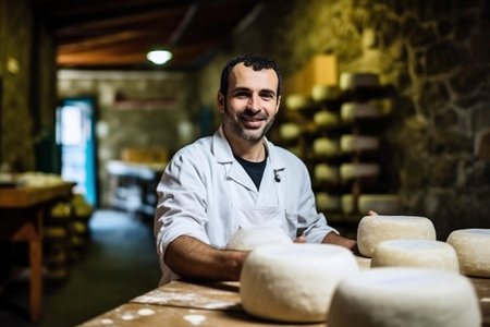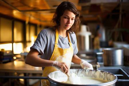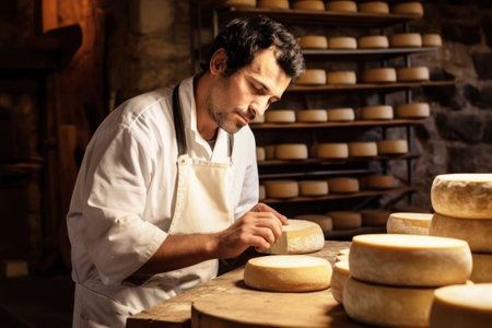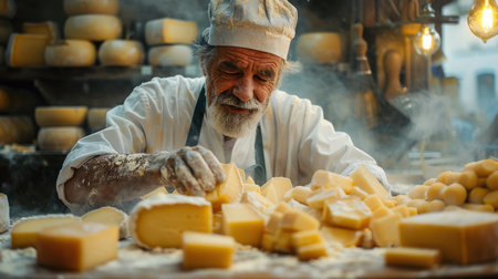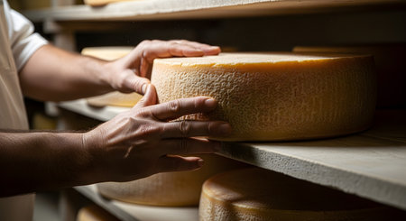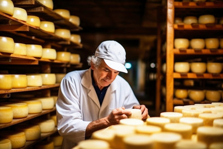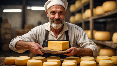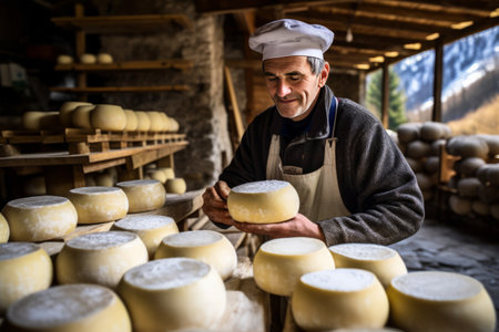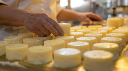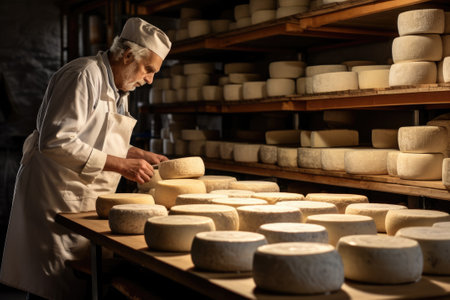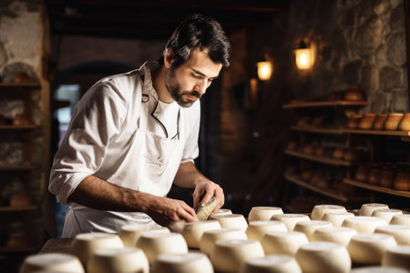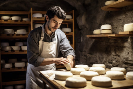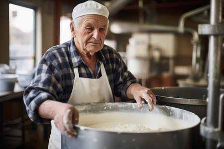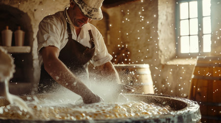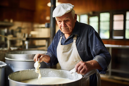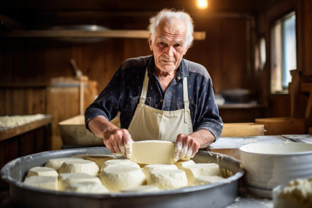 A skilled cheese maker crafts artisanal cheese in a traditional setting, showcasing unique techniques. Generative AI