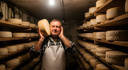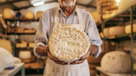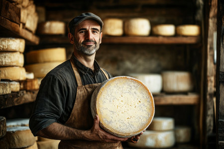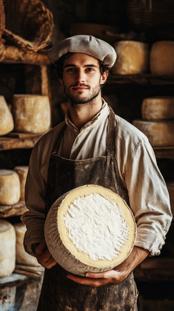 Close-up of a man cheesemaker in a traditional apron, proudly holding a round of freshly made cheese, surrounded by rustic wooden shelves filled with aging cheese wheels