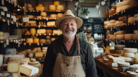 Portrait of mature cheesemaker in cellar with ripening cheese on shelves.