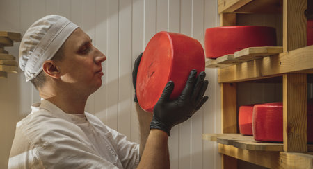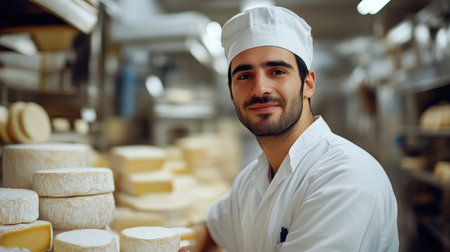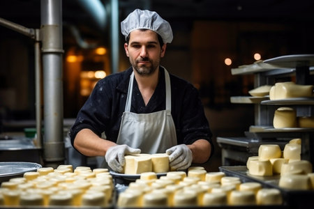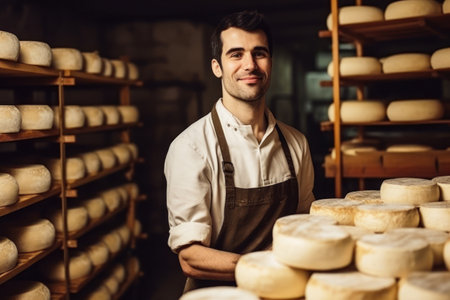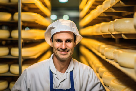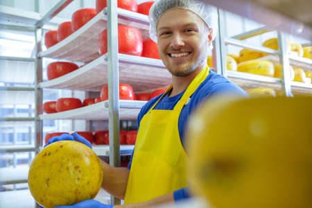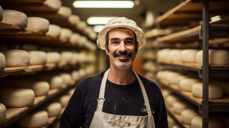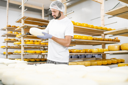 A man is a cheese maker who makes delicious cheese in a cheese factory.