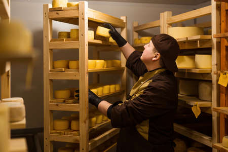Handsome cheesemaker is checking cheeses in his workshop storage.