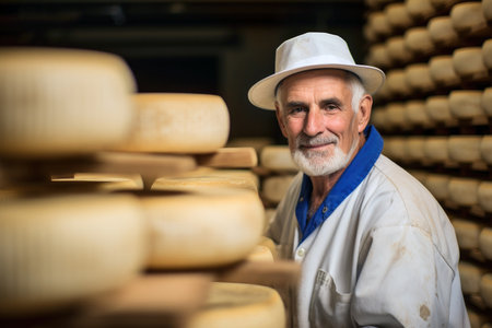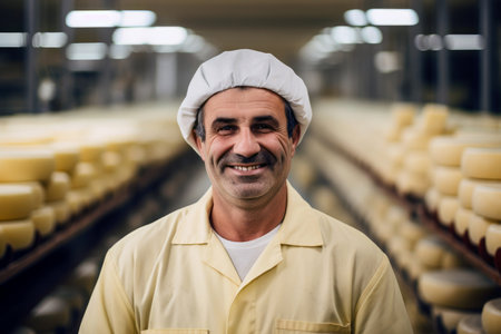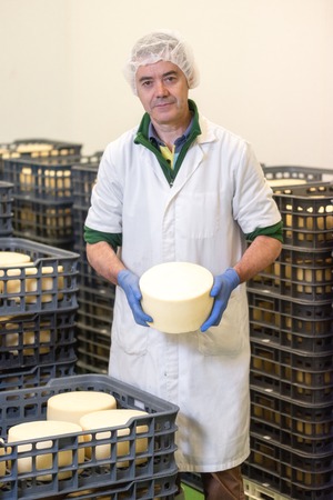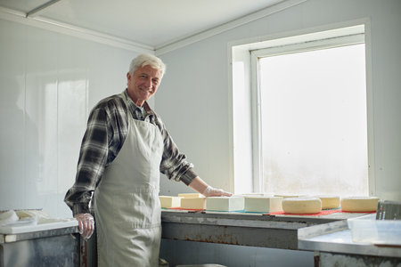 Portrait of a mature cheese maker working in a cheese factory.