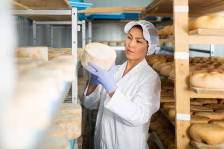 Skilled woman controlling maturing process of cheese wheels
