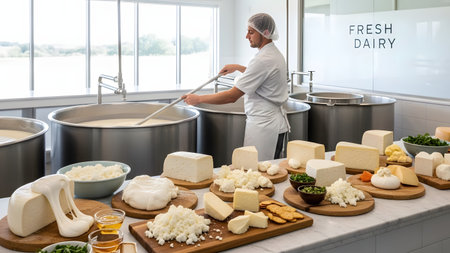 A worker in protective gear stirs milk in a large stainless steel vat at a dairy production facility. In the foreground, a variety of fresh artisanal cheeses are displayed on wooden boards, showcasing the final product.