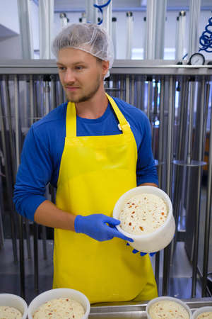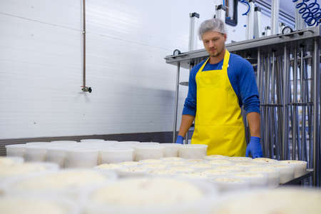 Handsome cheesemaker making curd cheese in his factory.