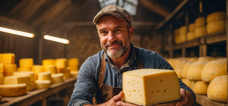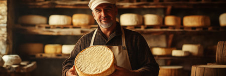 A realistic close-up of a smiling male cheesemaker in a traditional apron holding a fresh round of cheese, with rustic wooden shelves filled with aging cheese wheels behind his, banner
