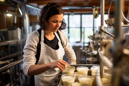 A woman working in a factory making cups. Industrial cheese production plant. Modern technologies. Production of different types of cheese at the factory.