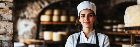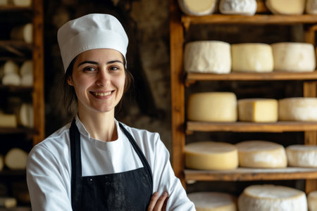 A dedicated female cheesemaker in a white uniform and black apron stands in a rustic cellar, with wooden shelves full of fresh, handcrafted cheese wheels, exemplifying small-scale dairy production
