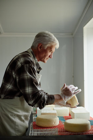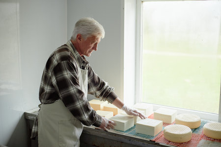 Senior Caucasian man arranging blocks and wheels of cheese on drying racks near window, wearing apron and gloves, working in cheese production facility, focused on task