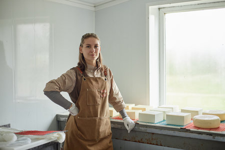 Caucasian young adult woman standing in cheese production facility arranging blocks of cheese on table near window, wearing apron and gloves, looking confidently at camera