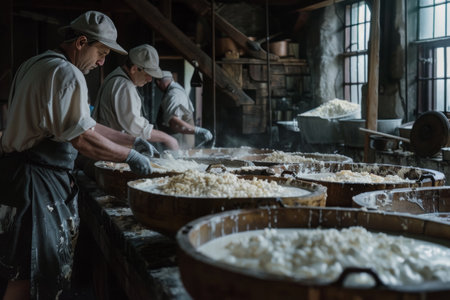 Artisans making cheese in large wooden tubs in a rustic creamery.