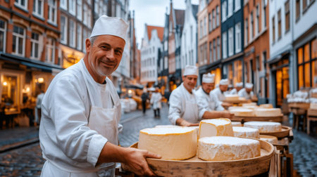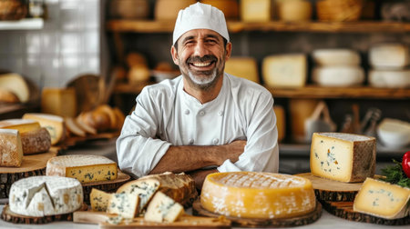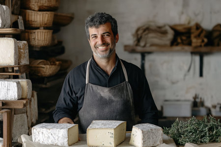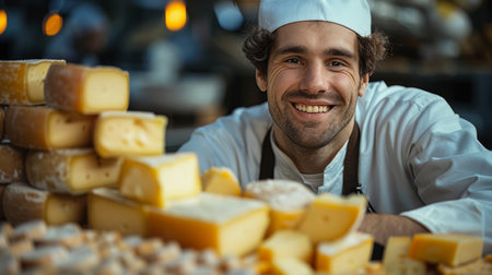 Handsome male cheese maker in uniform smiling warmly as he forms artisan cheeses. The scene captures the charm of traditional cheese crafting.