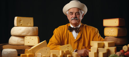 Cheese seller with a lot of cheeses on a black background