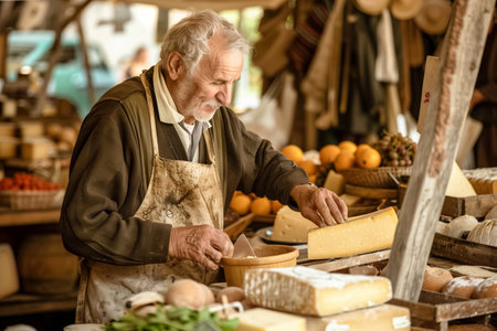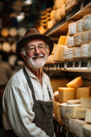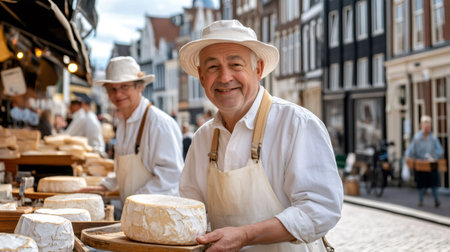 Smiling elderly man stands proudly at a bustling market stall filled with an array of artisanal cheeses, surrounded by shoppers and colorful displays, creating a lively and inviting atmosphere