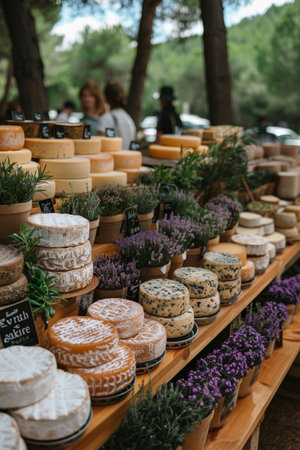 Assortment of organic cheeses displayed on wooden table in outdoor market setting