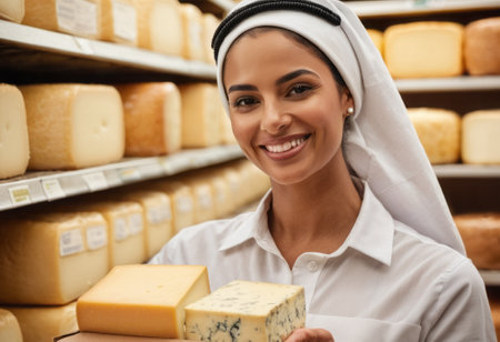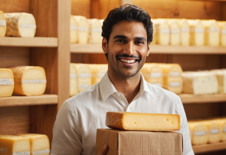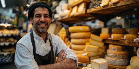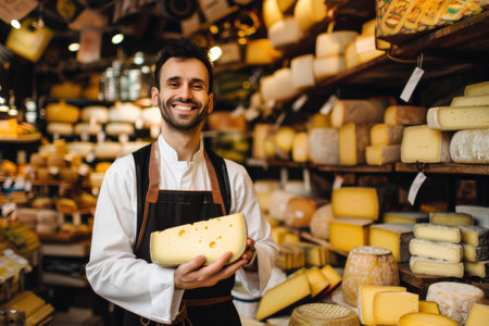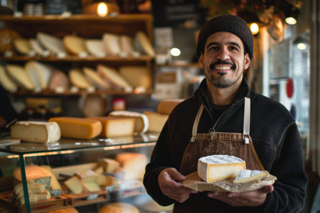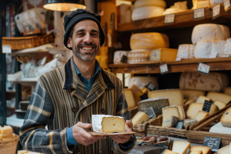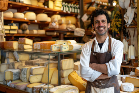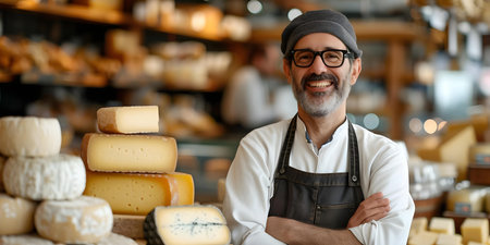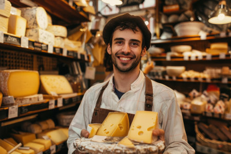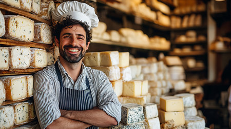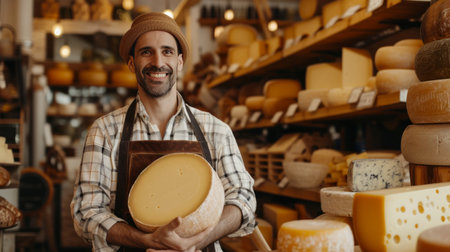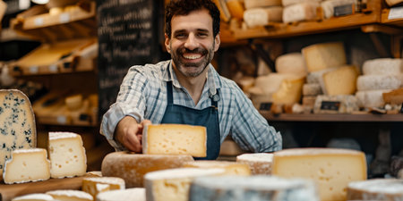 Smiling cheesemonger presenting artisanal cheese in a traditional cheese shop with a variety of products. A.I.