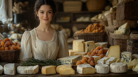 Generative AI Image of Beautiful Young Woman Selling Cheese and Peach Fruit at Market