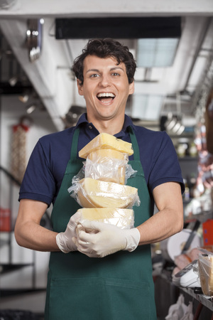Portrait of cheerful young salesman carrying cheese in store