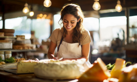 A dedicated female cheesemaker in a white uniform and black apron stands in a rustic cellar, with wooden shelves full of fresh, handcrafted cheese wheels, exemplifying small-scale dairy production