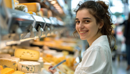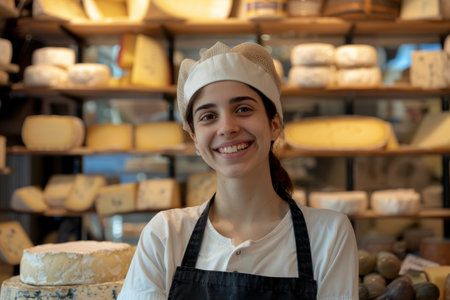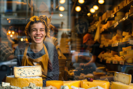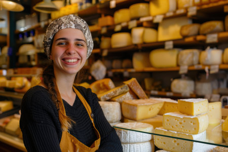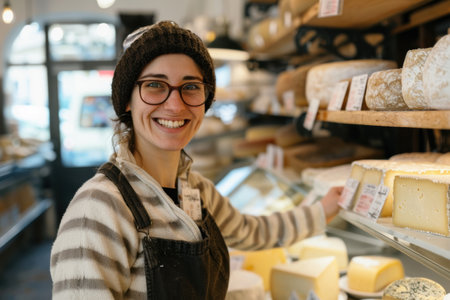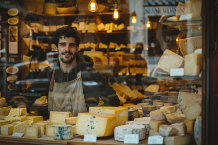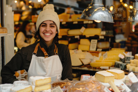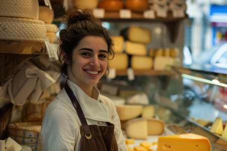 A smiling cheese vendor, 30, showcasing cheese varieties in a European shop