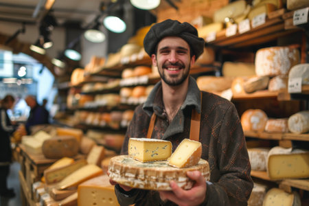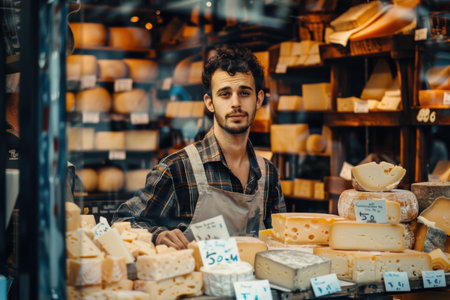 Trendy 30-year-old cheese vendor in a European store, displaying cheese